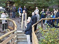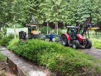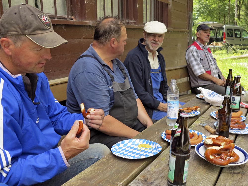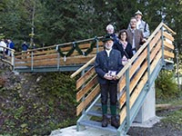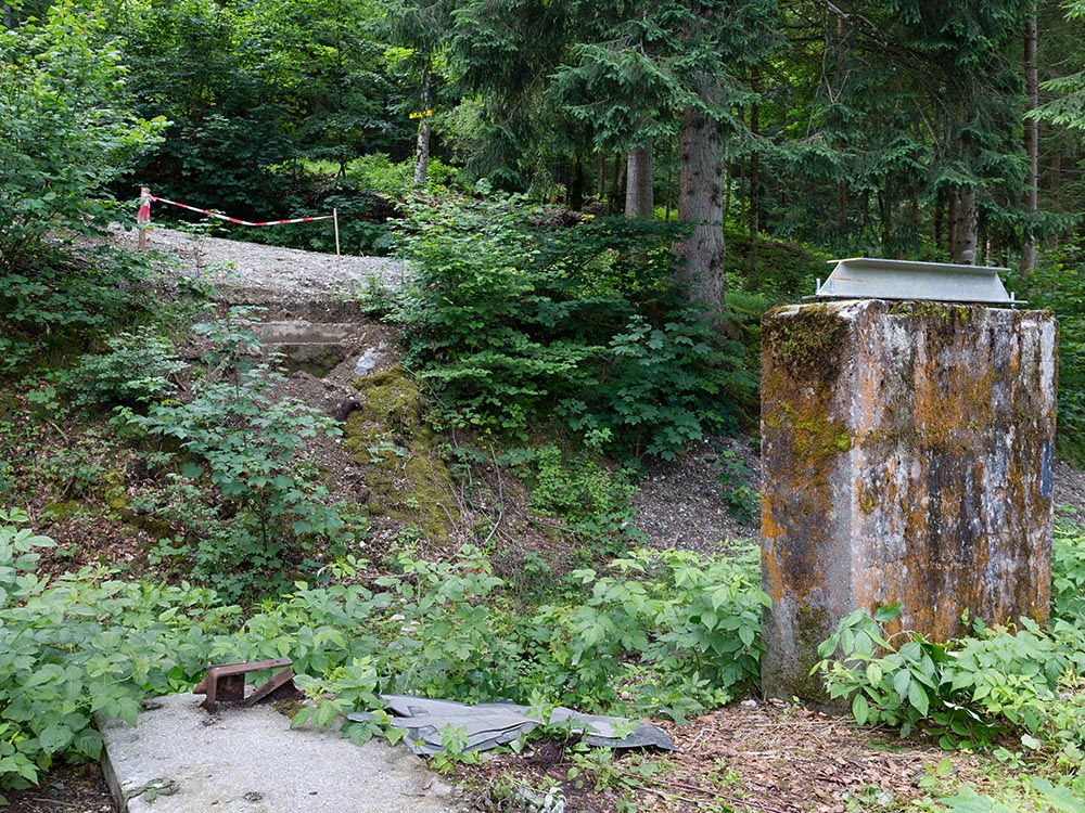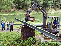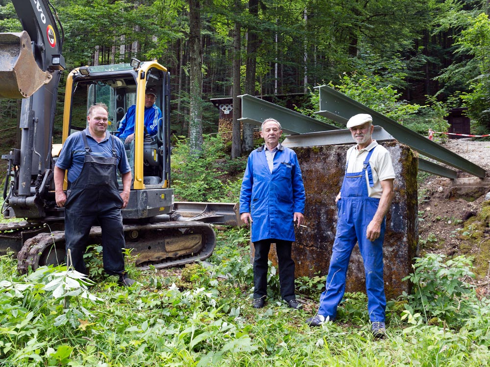 Von der historischen Zuschauerbrücke an der Seekurve waren - wie auf dem ersten Foto zu erkennen - nur noch Reste des Aufstiegs erhalten. Auch hier mussten wir aus Gründen der Sicherheit und um den Zuschauern einen risikolosen Zugang zur Bobbahn zu gewährleisten, einen neuen Fußgängerübergang unter Einbezug der heutzutage geltenden Sicherheitsbestimmungen bauen. Wie auch bei der oberen Zuschauerbrücke hat Peter Utzschneider aus Ohlstadt den weitaus größten Anteil an Arbeitsstunden geleistet. Mit einigen Helfern aus der Bobabteilung konnte auch dieser Übergang