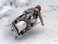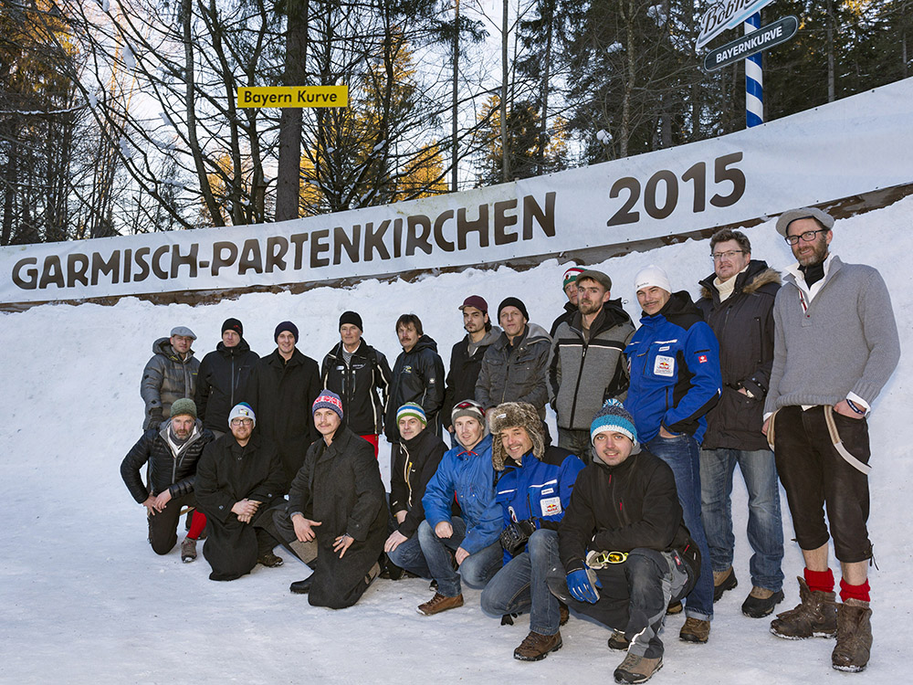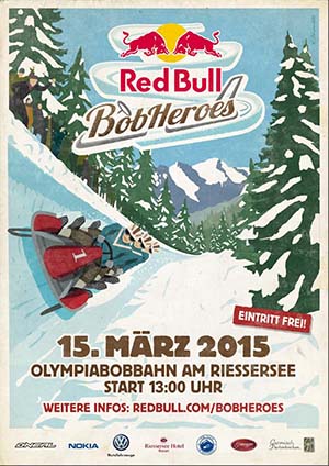 Am 15. Februar 2015 fand auf der Historischen Natureis-Bobbahnam Riessersee das erste Red Bull Bob Heroes Renne statt. 14 Teams aus Deutschland, der Schweiz und Österreich hatten ein Jahr Zeit um ihre Schlitten nach eigenen Plänen zu schmieden um bei dem spektakulären Renen dabei zu sein. Viele Arbeitsstunden wurden zm Aufbau der Bobbahn investiert, aber die Mühe hat sich gelohnt. Etwa 2000 begeisterte Zuschauer wurden Zeuge dieser einmaligen Veranstaltung. Auf den folgenden Seiten können Sie sich ein Bild über die Red Bull Bob-Heroes machen. |