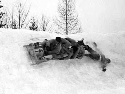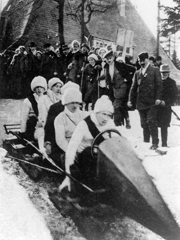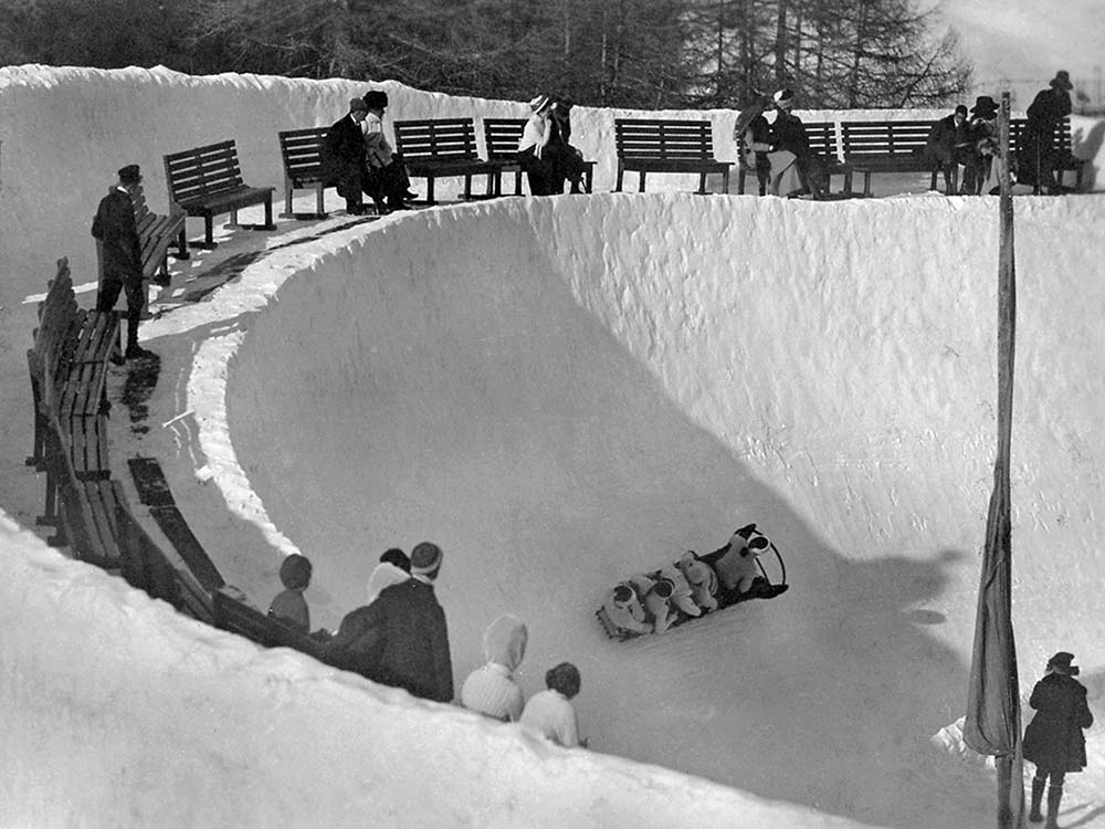Der 1897 gegründete „Saint Moritz-Bobsleigh-Club“ ist der älteste Bobclub der Welt – doch es fehlte die ersten Jahre eine standesgemäße Bahn. Endlich! Im Winter 1903/04 war es so weit, die Schweizer konnten die erste Bobbahn, zwischen den Orten St. Moritz und Celerina gelegen, eröffnen. Hier also steht die Wiege des Bobsports und hier wurden die Erfahrungen gesammelt und später in vielen Ländern verwertet, wo sie in Bezug auf Bahnbau und Rennen Anwendung fanden. Bald regten sich auch im benachbarten Deutschland die ersten Bobfahrer. Bereits im Jahre 1905 starteten auf der Dorfstraße von Schreiberhau (Riesengebirge) die ersten Bobs. Es folgten die Orte Oberhof, Hahnenklee, Bad Kohlgrub, Garmisch-Partenkirchen, Winterberg, Krummhübel, Schierke, Triberg, Friedrichsroda, Ilmenau, Flinsberg, Schmiedeberg u.a. mit teilweise beeindruckenden Bahnanlagen. So war beispielsweise die 1907 in Kohlgrub beim Kurhotel gebaute Bahn 2000m lang und verfügte über eine eigene Wasserleitung. Sie hatte allerdings nur zwei Jahre Bestand. |